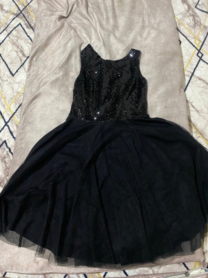 Siyah, parlak detaylı, kolsuz ve V yakalı, gövdeye oturan midi elbise, gotik parti tarzına uygun. ✨