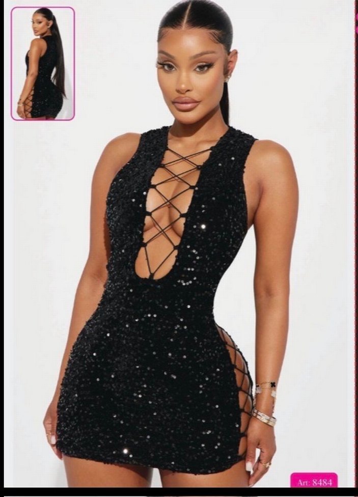 Siyah, v yaka ve çapraz askılı mini elbise, parlak payetlerle kaplıdır. Gotik ve gösterişli tarzda, parti için uygundur. ✨