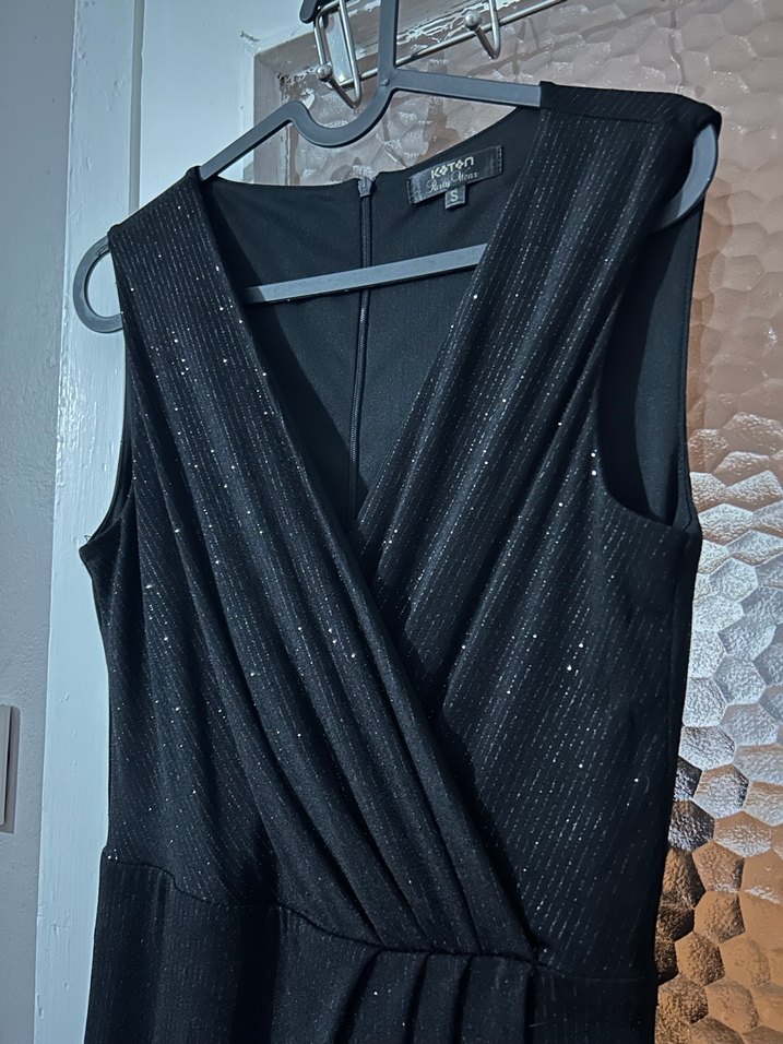 Siyah, parlak kumaştan yapılmış, drapeli V yakalı ve kolsuz, vücuda oturan uzun elbise, romantik akşamlar için uygundur. ✨ Bir kez giyildi koton marka