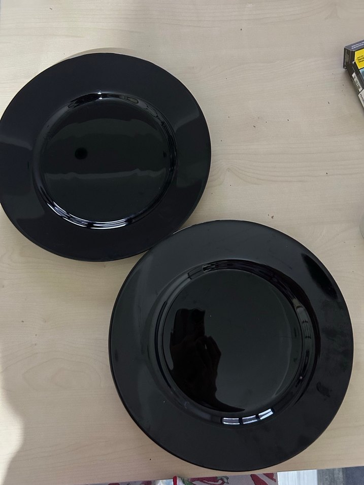 İki adet siyah parlak yüzeye sahip yemek tabağı, yemek sunumu için uygun. ️
