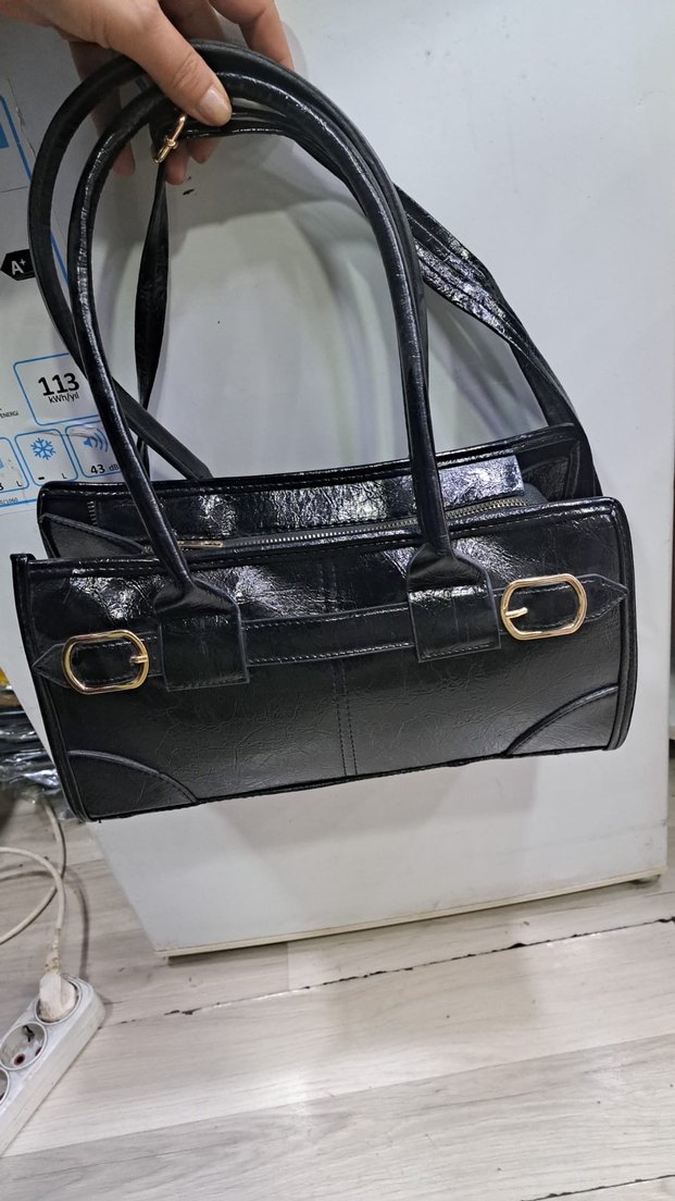 Yılan desenli, parlak siyah deri kadın çanta, tokalı detaylarla klasik şıklık ve iş stiline uygun. 0 mağaza ürünüdür