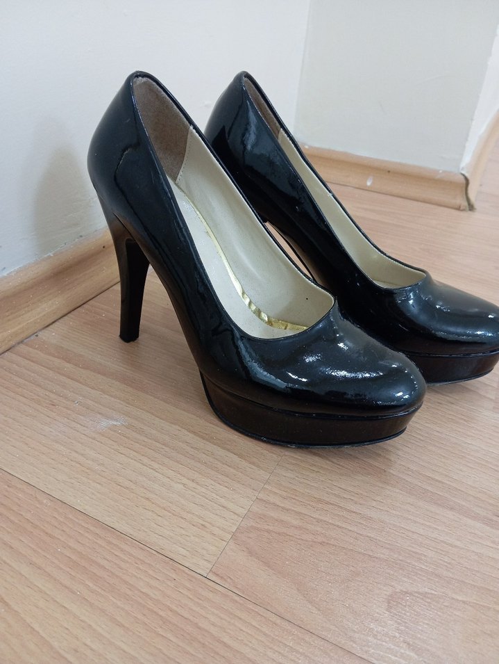Siyah parlak yılan desenli stiletto topuklu ayakkabılar, modern klasik ofis şıklığı için uygundur. Kauçuk malzemeden üretilmiştir.
