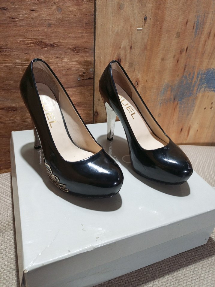 Ofis için modern klasik tarzda, parlak siyah yılan desenli, tokalı stiletto ayakkabılar.