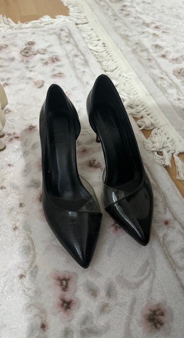 Siyah parlak yılan desenli, sivri burunlu stiletto. Modern klasik tarzda, ofis için uygun kauçuk topuklu ayakkabı.