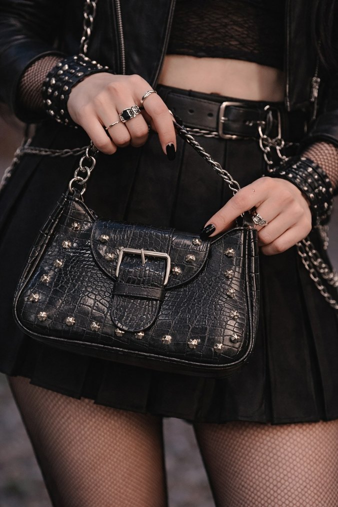 Siyah parlak deri, yılan desenli, tokalı kapaklı, gümüş renkli zımbalı ve zincir saplı grunge punk tarzı çanta. el tutma kisminda hafif acilma var ama degistirilirse ya da yapistirilirsa cozulebilir, o kadar buyuk degil yapilmasa da olur