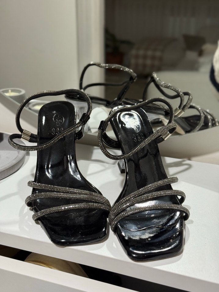 Siyah parlak yılan desenli ve tokalı ince topuklu ayakkabılar, romantik gece için göz alıcı gotik tarzda.