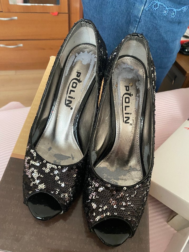 Parlak siyah yılan desenli, ışıltılı topuklu kadın ayakkabısı. Kauçuk malzemeden, gotik ve gösterişli parti stiline uygun. ✨