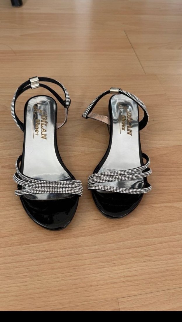 Klasik zarafeti ve çağdaş stili birleştiren, yılan desenli, parlak siyah stiletto topuklu, tokalı sandaletler.