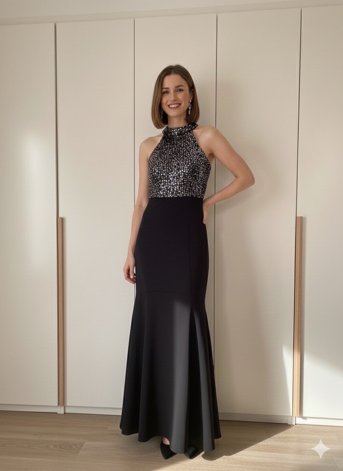 Yüksek yaka, kolsuz, parlak pullu yılan desenli üst kısmı ve siyah uzun etekli, klasik kesim abiye elbise.