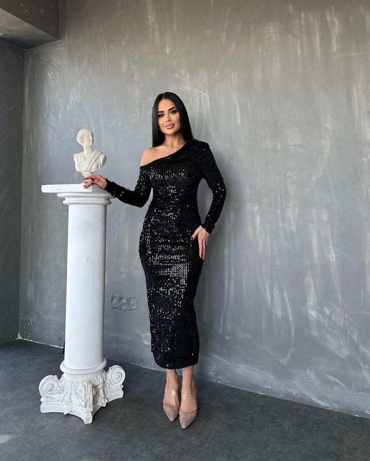 Siyah, parlak pullarla süslenmiş, uzun kollu, straplez yakalı, yılan desenli uzun ve vücuda oturan abiye elbise.