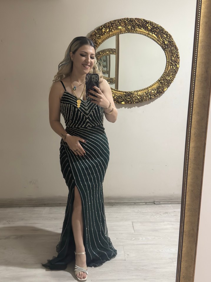 Parlak siyah zebra desenli, drapeli, ince askılı ve V yakalı uzun abiye elbise, şık ve fit kesimlidir. Parti için uygundur. ✨