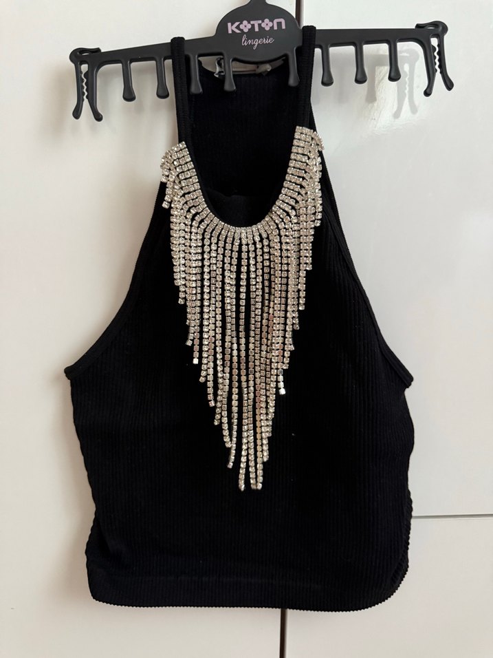 Siyah, parlak zincir detaylı ve nakış desenli body zinciri, goth tarzında gösterişli parti kombinleri için uygun. ✨Zara marka Xs s beden uyumludur