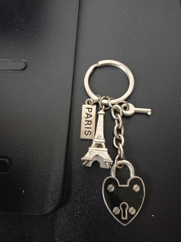 Siyah parlak anahtarlık, zincir detaylı, kalp şeklinde kilit, Eyfel Kulesi ve 'PARIS' yazılı etiket içerir. Goth ve rock punk tarzını yansıtır. #paris #france #eyfel