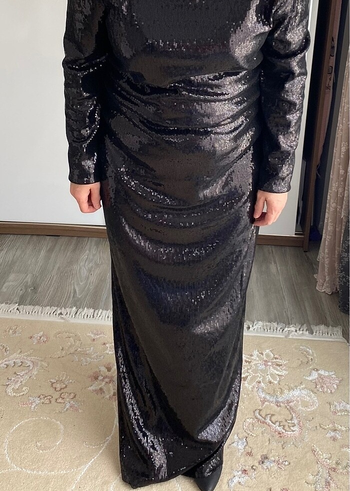 Siyah, uzun kollu, sütyen hizasında biten oval bir sırt dekoltesi var, full payet, içi astarlı. 44 beden. 135 cm. Bir kez giyildi. Bir sıkıntısı yok