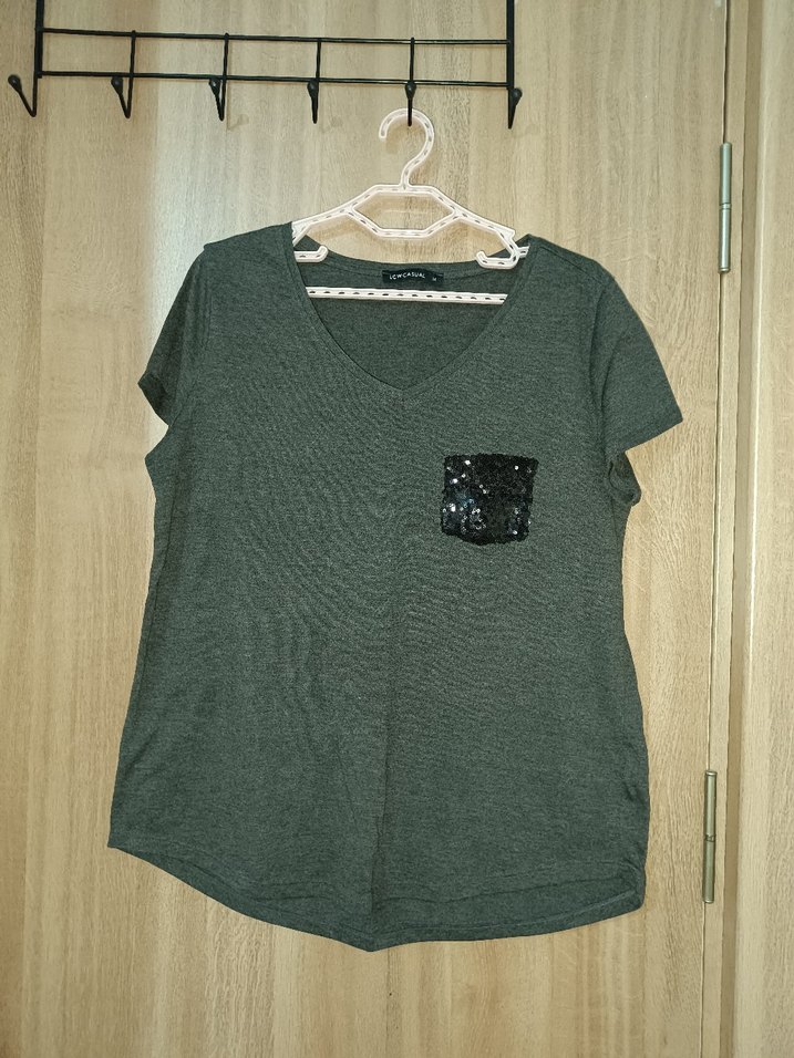 Gri, v yakalı, kısa kollu, bol kesim tişört, siyah payetli cep detayı ve yumuşak sentetik kumaştan üretilmiştir. ✨
