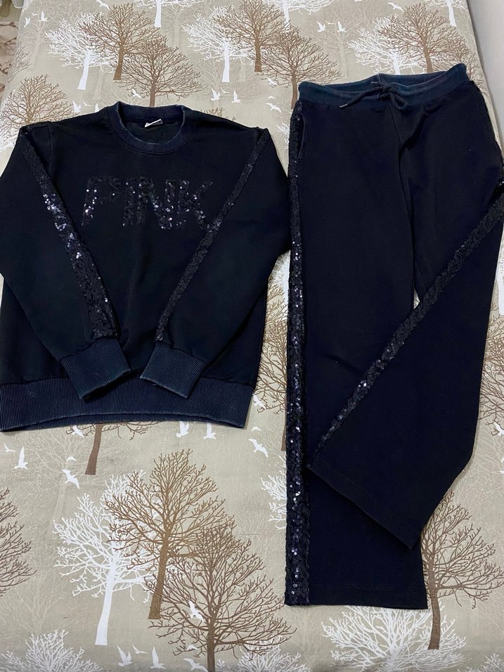 Siyah, bol kesim eşofman takımı, uzun kollu ve bisiklet yaka. Kol, ön ve pantolon yanlarında payet detaylı, sentetik kumaştan günlük kullanıma uygun. ✨