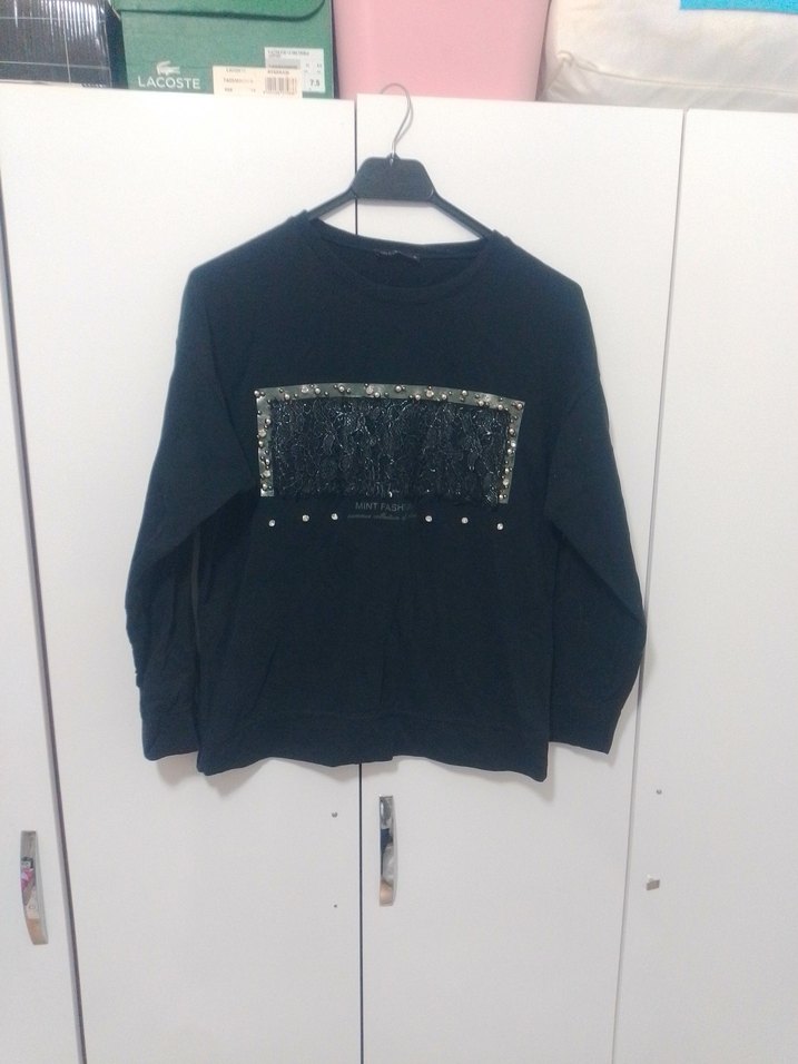 Siyah, uzun kollu, yuvarlak yaka, payet detaylı ve rahat kesim kadın sweatshirtü. Günlük kullanım ve sokak stiline uygun. ✨