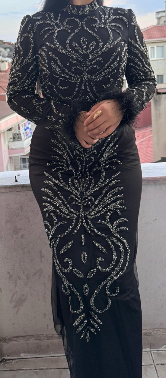 V yaka ve uzun kollu, tüy detaylı, siyah payet işlemeli bu dar kesim abiye elbise, düğünler için gotik ve ışıltılı bir şıklık sunar. ✨
