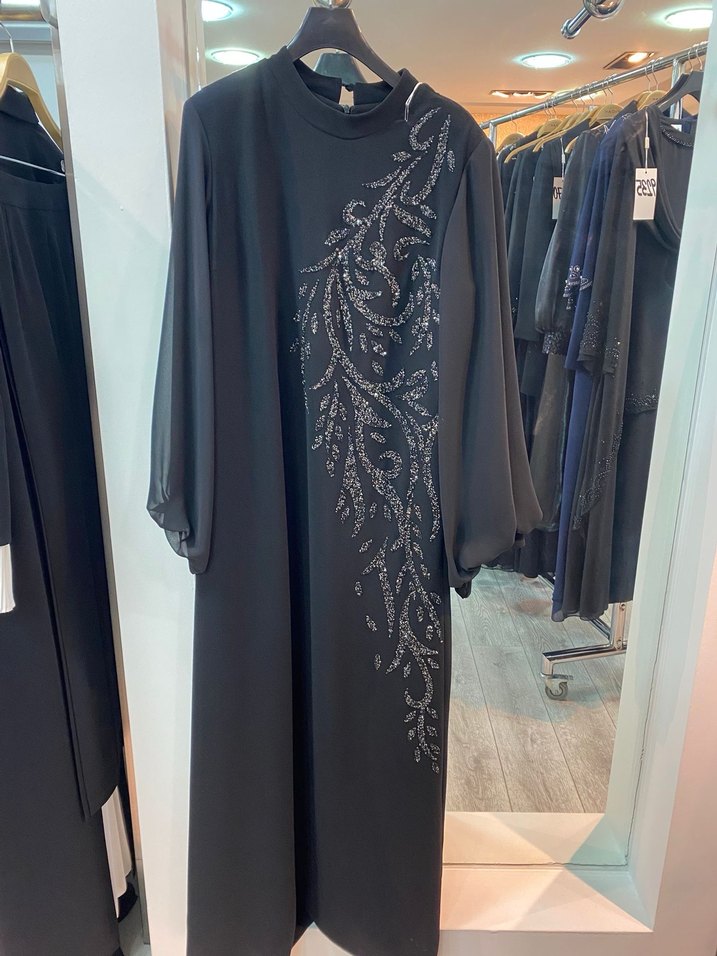 Siyah, yüksek yakalı ve uzun kollu, bol kesim uzun elbise. Sentetik kumaştan ve payet işlemeli, ofis kullanımı için uygun. ✨firma ürünü etiketli 42/44 beden uyumlu