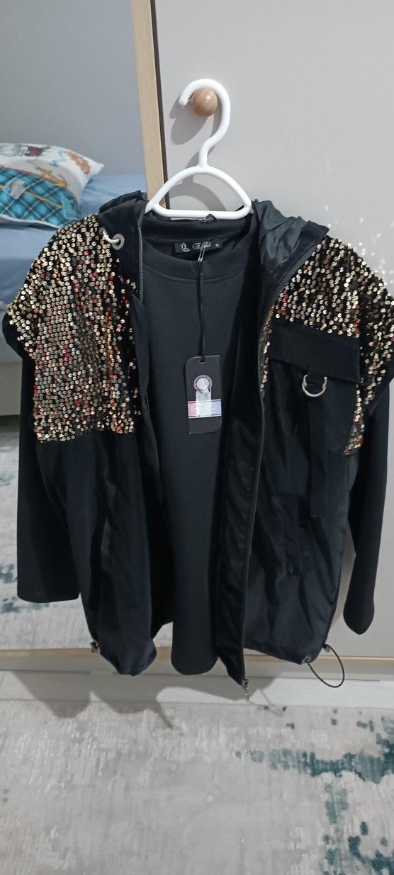 Siyah uzun kesim, bol kesim kadın yelek uzun kollu ve bisiklet yaka body , pantolon Sentetik kumaştan üretilmiş, payet detaylarıyla süslenmiş, günlük kullanım için uygun. ✨s-m uyumludur