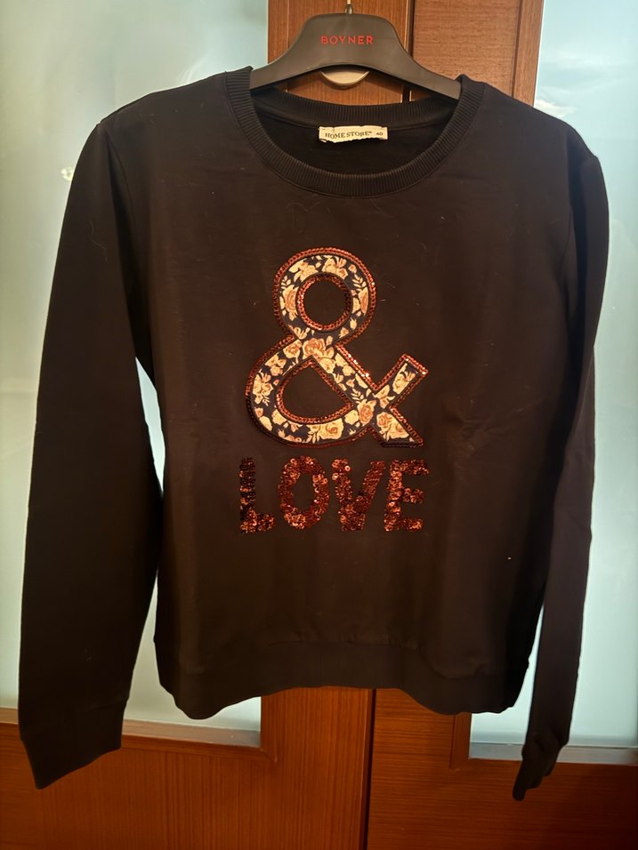 Siyah, uzun kollu, yuvarlak yaka ve bol kesim kadın sweatshirt. Önünde çiçek desenli & işareti ve payetli "LOVE" yazısı bulunur. Yumuşak tekstil kumaştan, günlük rahat stil için uygundur. 40 beden ama dar kalıp m bedene uyumlu
