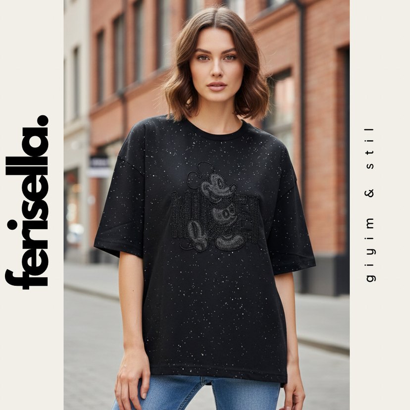 Siyah kısa boy, kısa kollu, yuvarlak yaka, payetli baskılı tişört. Oversize kesim, sokak stiline uygun. ✨ S M L MEVCUT