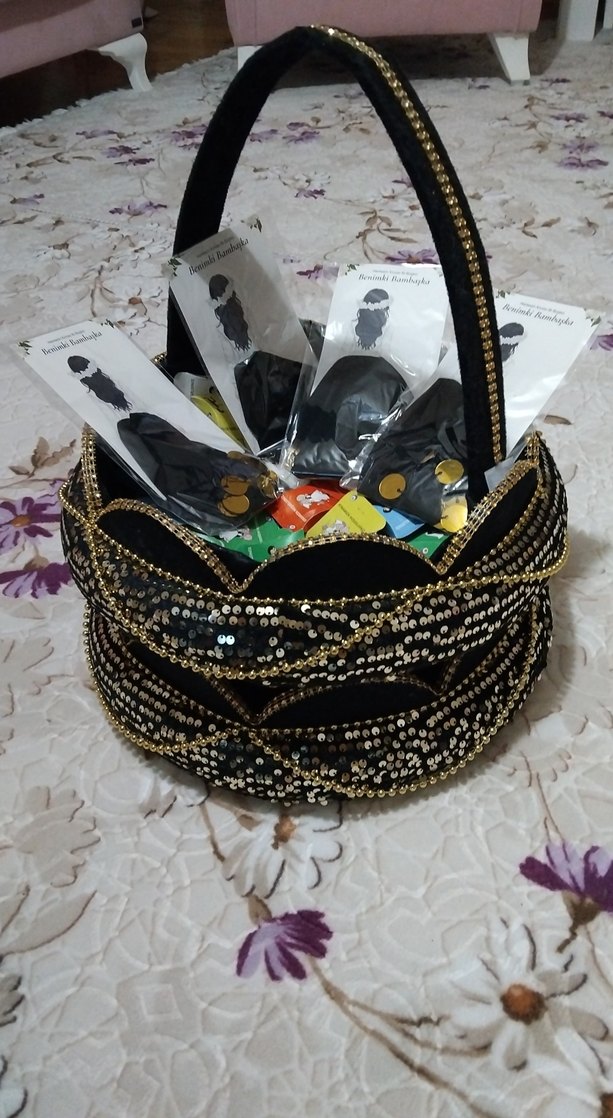 Siyah ve altın payetlerle süslenmiş, sağlam saplı kına gecemde bir kez kullandım içinde dagıtmalık kınası ve 4 tane özel yapım halay mendili ile gönderim saglıyıcam