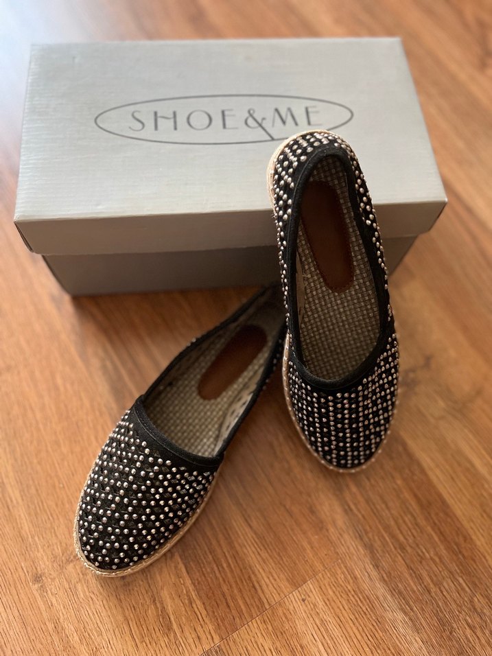 Siyah, parlak puantiyeli payetlerle süslenmiş dolgu topuklu espadril. Kauçuk taban, günlük kullanım için uygundur. Marka: SHOE&ME.