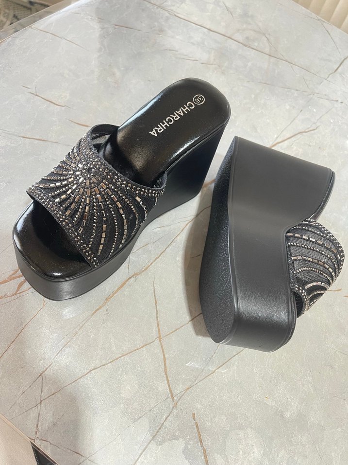 Siyah Payetli Dolgu Topuklu Kadın Terlik