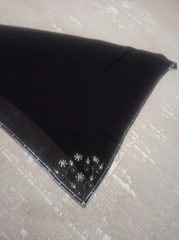 Siyah sentetik kumaştan, payetli detaylara sahip, mütevazı gotik tarzda kadın fular.