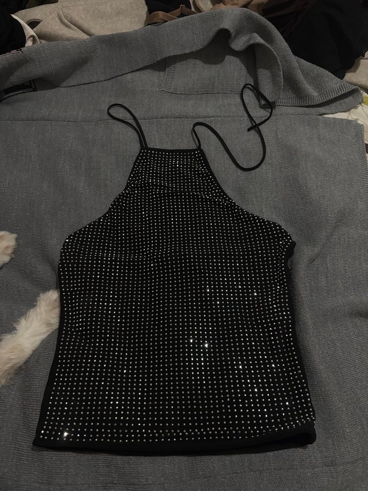 Siyah payetli polka dot desenli, sentetik kumaştan yapılmış, halter yaka ve kısa mini kesime sahip dar kesim atlet. Sokak stili ve dış mekan kullanımı için uygun. ✨
