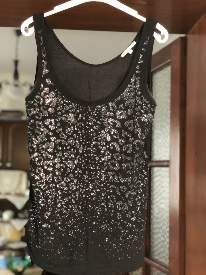 Siyah, payetli baskılı ve penye kumaştan, dar kesim, kolsuz, yuvarlak yaka kadın atlet. Rock punk tarzıyla parti ve gündelik kullanıma uygun. ✨