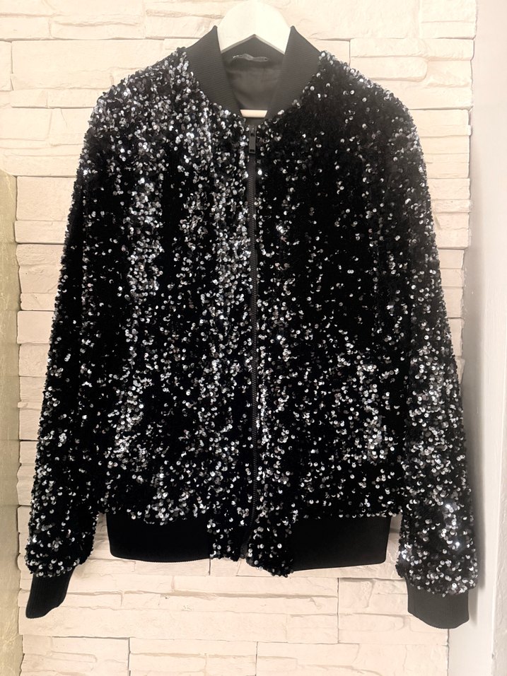Payetli detaylara sahip siyah kadın ceketi, uzun kollu ve yakası kesimli. Defosuz yeni