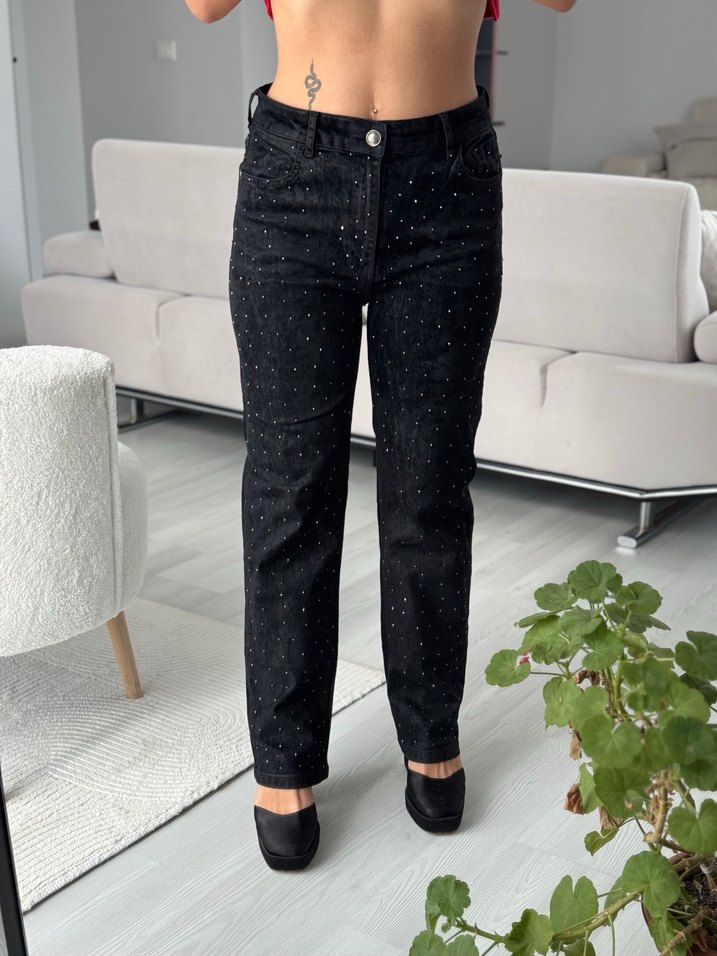 Ön arka taşlı Siyah denim kot pantolon, normal boy ve regular fit. Payet detaylarıyla sokak stiline uygun, günlük kullanıma ideal. ✨38-40-42 uyumlu