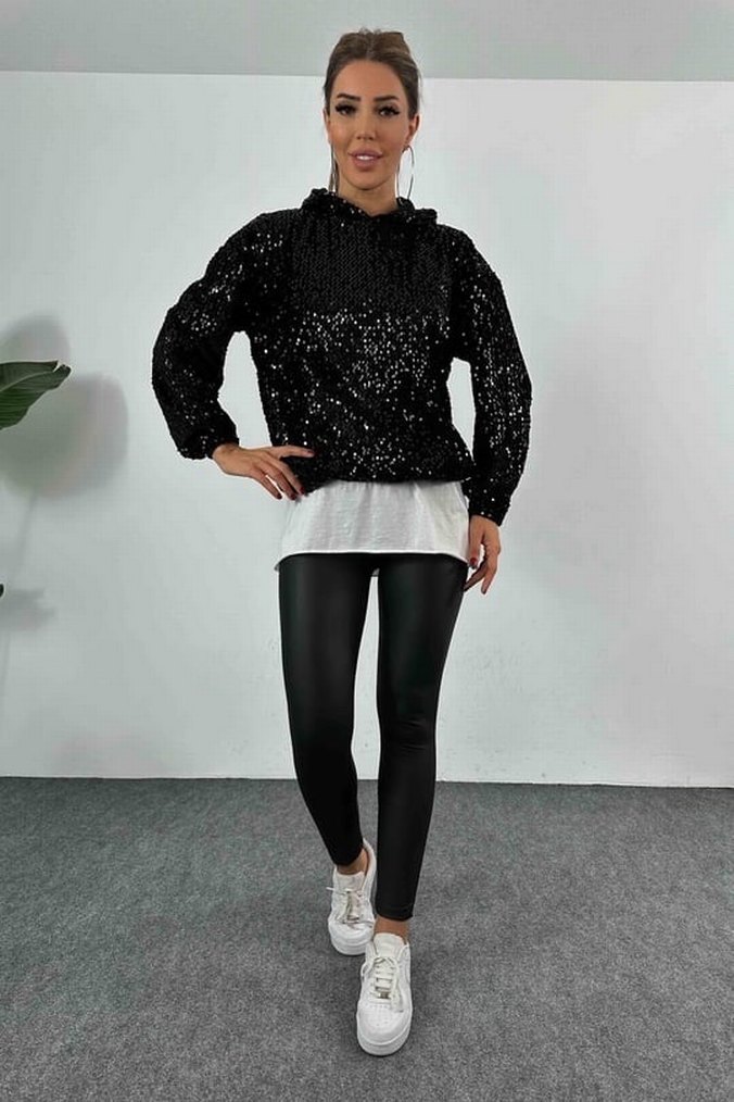 Siyah, payetli yılan desenli, uzun kollu, yuvarlak yaka, bol kesim kadın sweatshirt. Sentetik kumaştan, günlük sokak stili için uygun.