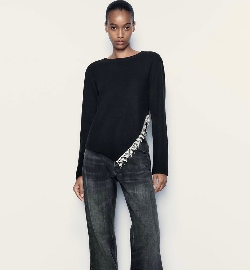 Siyah triko kumaştan, yuvarlak yakalı ve uzun kollu, yan kısmında payetdetaylı kadın triko. Günlük ya da şık stili için uygundur. ✨