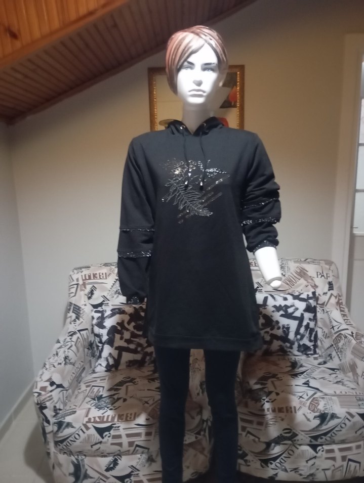 Uzun, siyah, kapüşonlu ve bol kesim kadın tunik. Yumuşak, sıcak kumaştan, payet ve baskı detaylı, rahat sokak stili için uygundur m L bedene uyumlu ✨