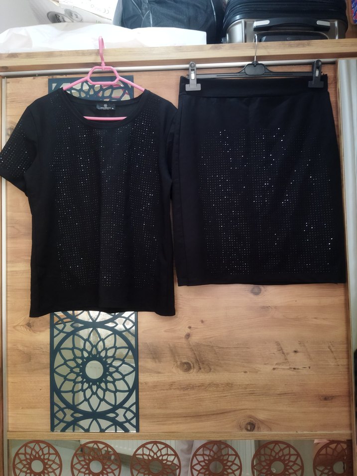 Siyah, payetli kısa kollu bluz,ve etek bol kesim ve yuvarlak yaka ile. Pürüzsüz sentetik kumaştan, gotik tarz için uygun. sayılı kullanıldı temiz dir sorunu yok