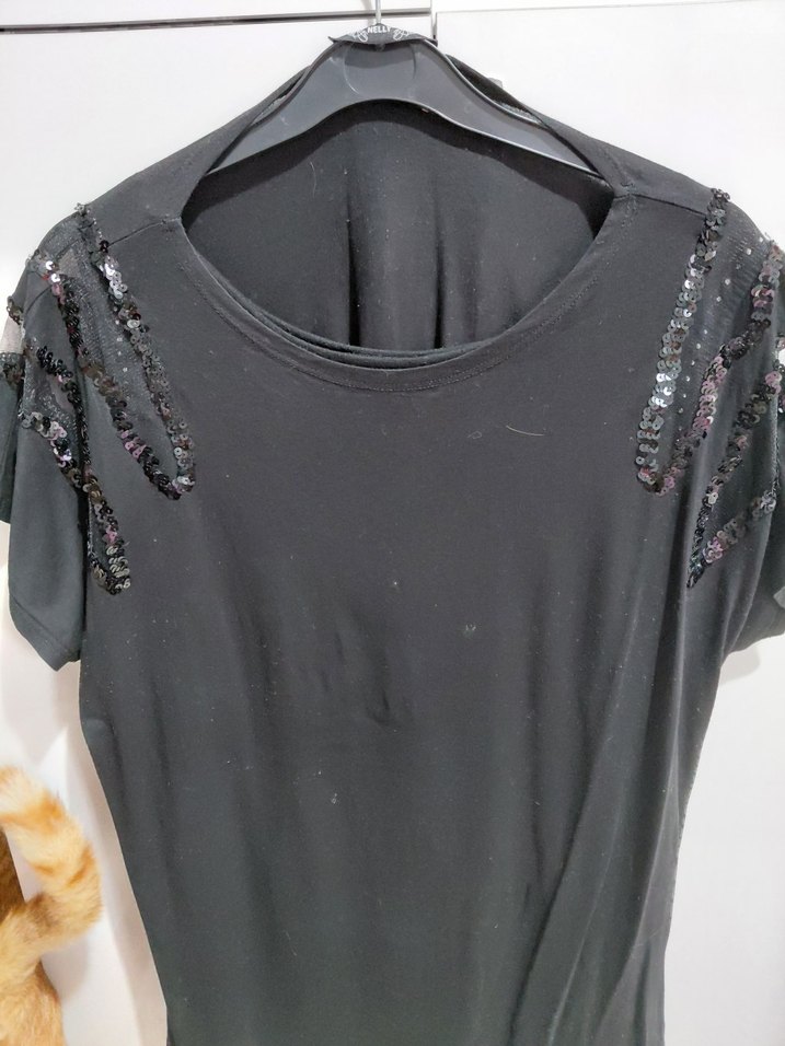 Siyah, kısa kollu, bisiklet yaka ve payet detaylı dar kesim bluz. Pürüzsüz sentetik kumaştan, avant-garde parti tarzına uygun.