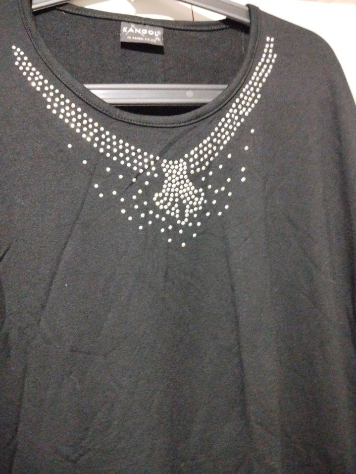 Yuvarlak yakalı, payet detaylı siyah kısa kollu bluz. Bol kesim ve normal boyda, günlük kullanıma uygundur. ✨