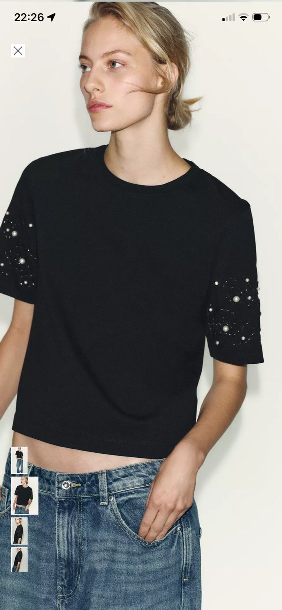 Kısa kollu, yuvarlak yakalı siyah denim kadın tişörtü, kollarında payet detaylarıyla. Salaş kesim ve normal boy, günlük sokak tarzı için uygun. ✨
