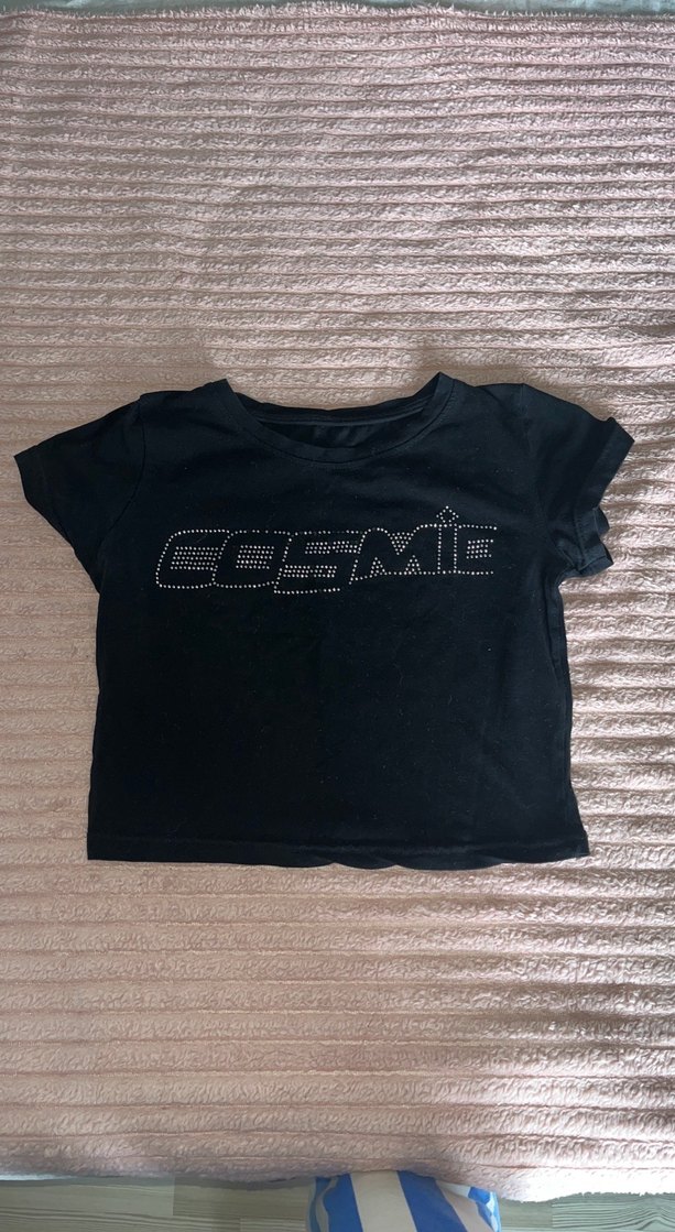 Siyah, kısa kollu, bisiklet yaka kız çocuk tişörtü, payetli "COSMIC" baskılı, sentetik kumaştan.