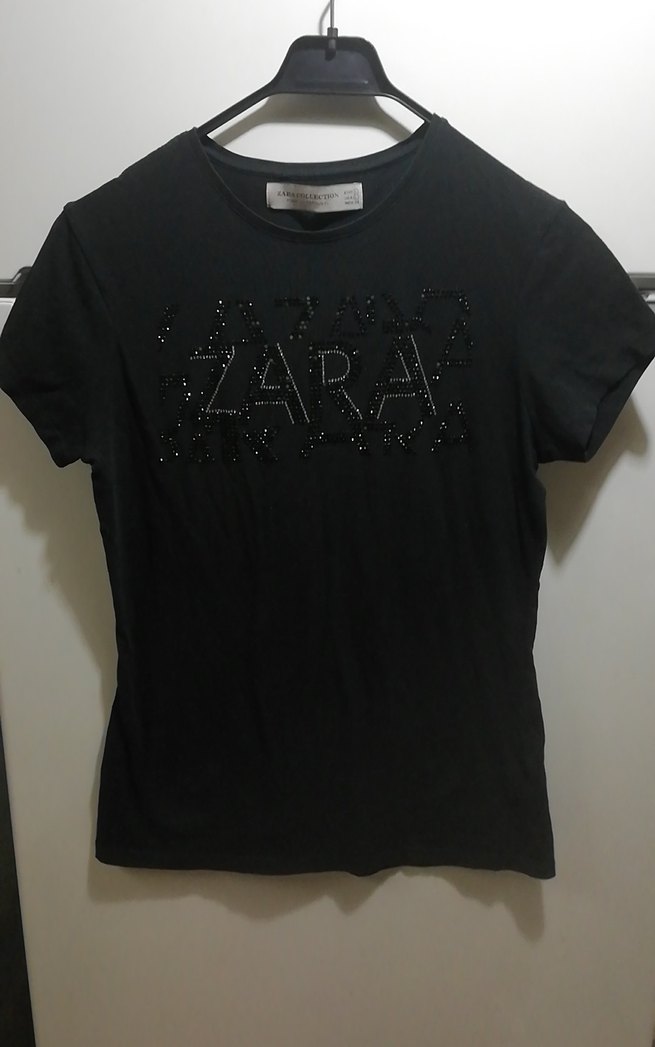 siyah, kısa kollu, yuvarlak yakalı, payetli baskılı ve dar kesim tişört. Zara markasına ait, trend sokak stili için uygundur. ✨