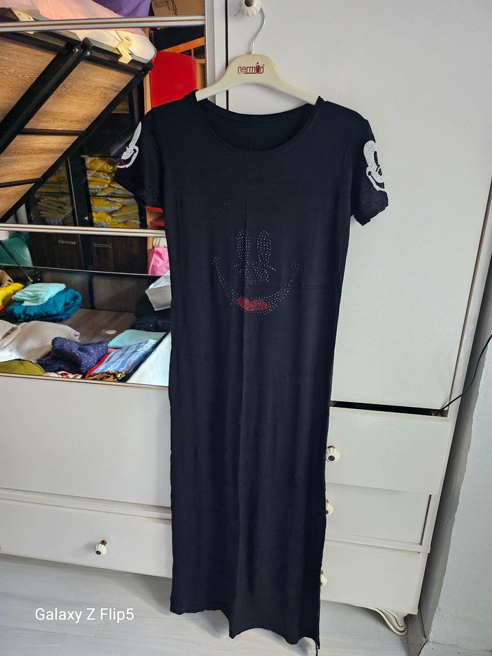 Siyah, kısa kollu, bisiklet yaka ve payetli baskılı dar kesim uzun elbise. Sentetik kumaştan, günlük sokak stili için uygun.