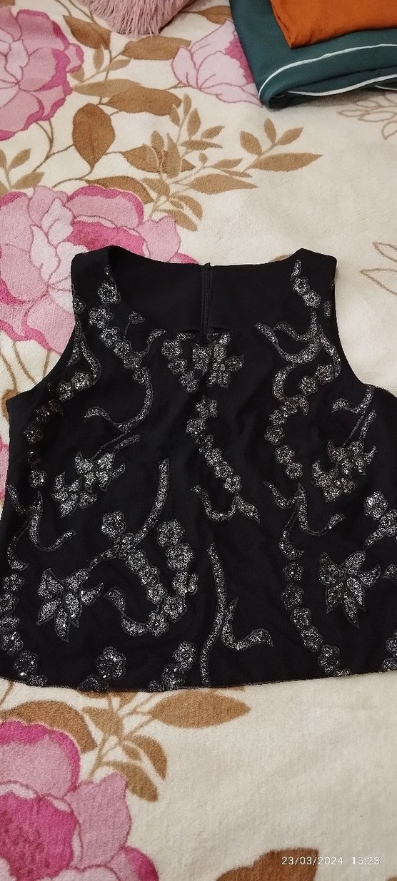 Uyakalı, kolsuz ve dar kesim siyah bluz, payetli nakışlı desenlerle süslenmiş, gotik parti tarzına uygun.