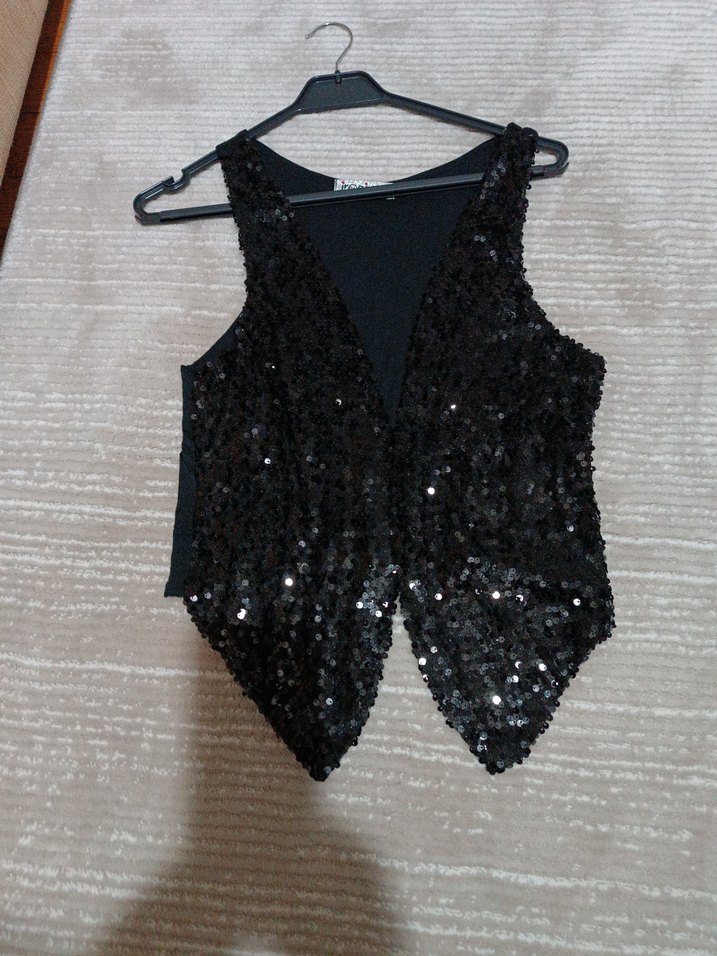 Siyah, kolsuz ve V yakalı bu mini yelek payetlerle kaplıdır ve şık bir görünüm sunar. Dar kesimiyle parti kombinlerine uygundur. ✨