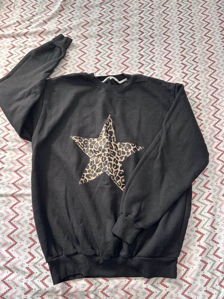 Siyah, uzun kollu, bol kesim, yuvarlak yaka sweatshirt. Önünde payetli leopar desenli yıldız detayı bulunur. Sentetik kumaştan üretilmiştir. ⭐