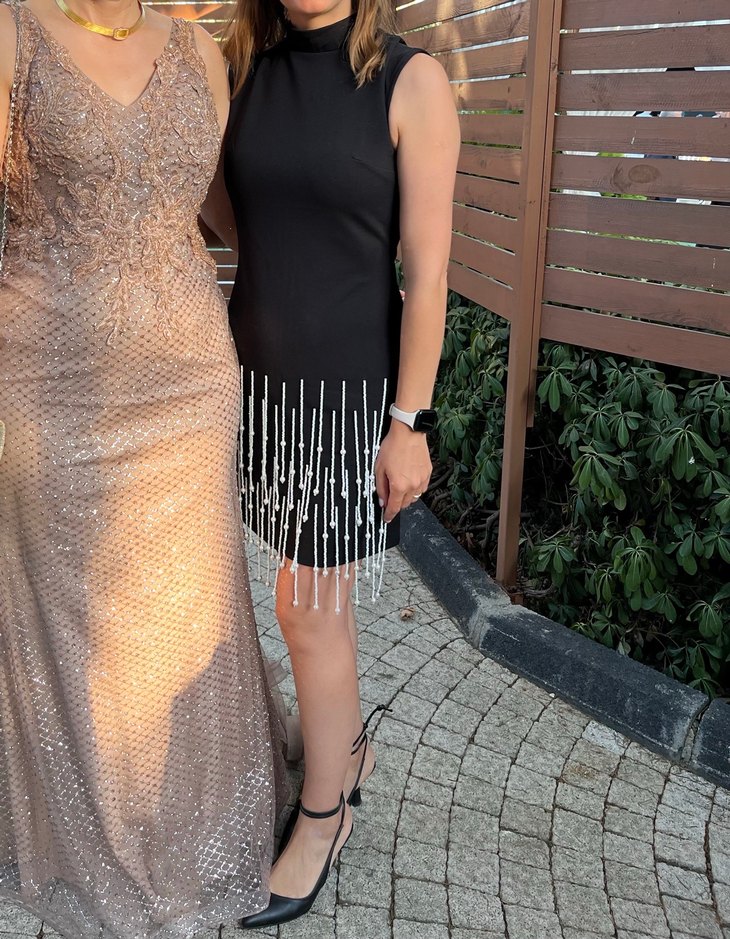 Bu siyah, midi boy, dar kesim elbise, askısız tasarımı, yılan deseni ve payet detaylarıyla parti için uygundur.