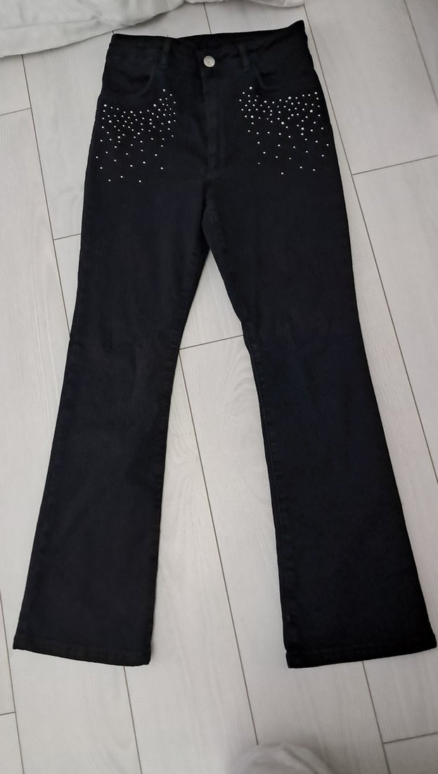 Siyah kot ispanyol paca yapışan kot pantolon, midi boy ve regular fit kesim. Ceplerinde payet detayları bulunur. Günlük kullanım için uygundur, gotik sokak stilini yansıtır.
