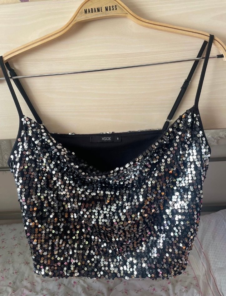 Siyah payetli mini atlet, askılı ve straplez yaka büstiyer . , cesur ve gösterişli tarz için uygundur.✨
